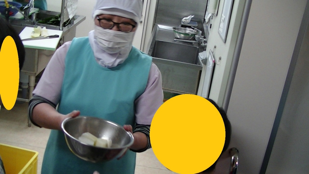 2月21日(水)の2・3時間目に「第2回食育教室」が行われました。いつも病院の献立を考えてくれている栄養士の冨樫郷子さんに、献立のできるまでを説明してもらった後に、栄養管理科の調理室の見学に行きました。子どもたちは、調理員さんの皮むきの手際に驚いたり、大きな冷蔵庫に入ったりして興味津々で見学しました。