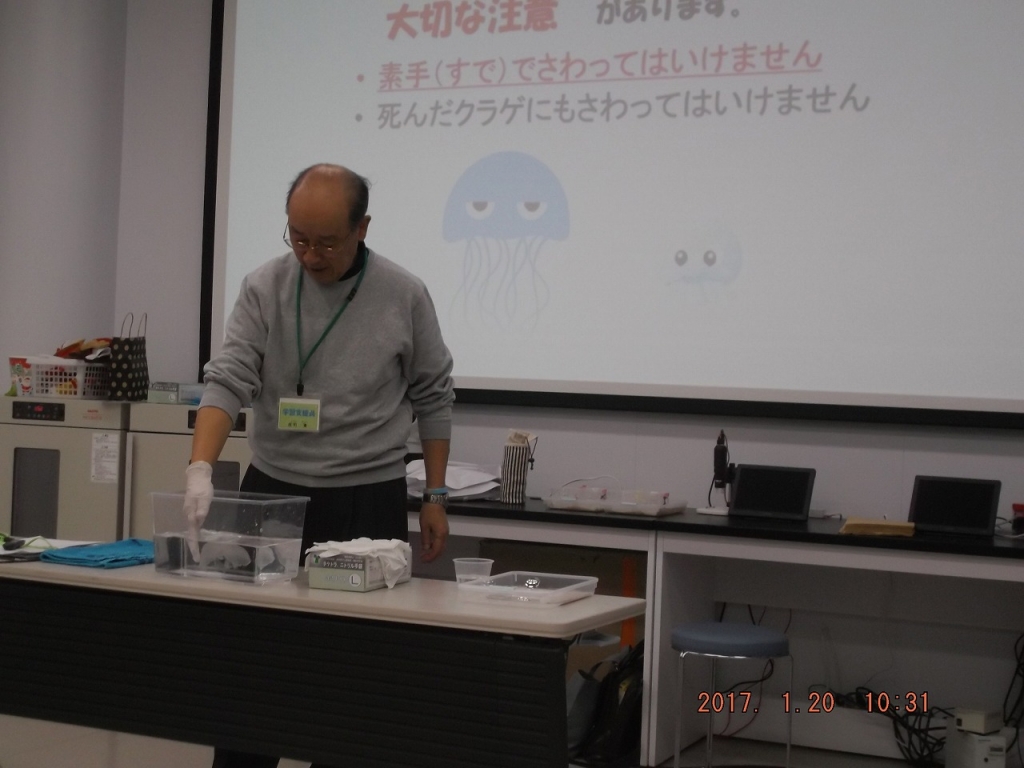 1月20日(金)に、おひさま分教室の校外学習があり、加茂水族館に行ってきました。クラゲ学習会に参加して、小さいクラゲを顕微鏡で覗いたり、クラゲの種類を学習したりしました。また、手袋をして実際にクラゲに触る活動では、児童・生徒から「思ったよりかたい」「ブニョブニョしてる」などの感想が聞かれました。普段なかなかできない体験に、とても興味を持って参加しました。